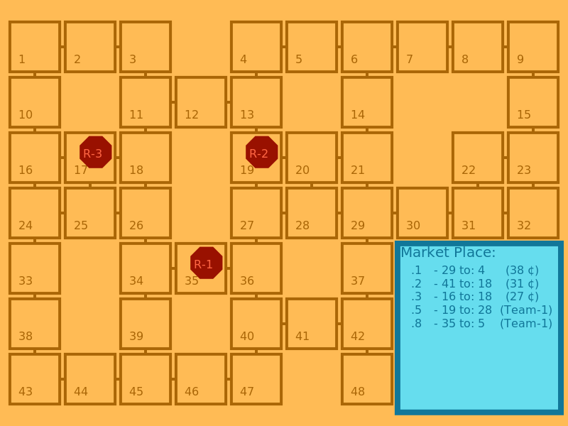 On peu y voir 3 robots rouges (R-1, R-2 et R-3) pouvant se déplacer sur un graphe composé de 48 cellules/dalles (tiles en anglais)